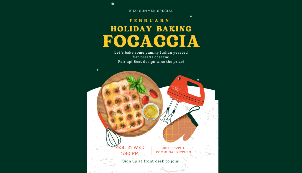 Let’s bake some yummy Italian flat bread Focaccia! Waiting for the dough to rise can be very healing! Pair up with friends, best design wins the special secret prize!